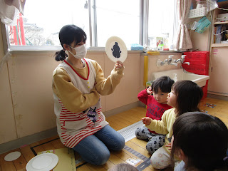 一月の遊びでもある、こま大会が20日にあります。3歳児からチャレンジします、先ずこまに紐をまくことから始めます。初めからは上手く回せません。日々コツコツ練習をする事が大切です。お家の方も応援をお願いします。